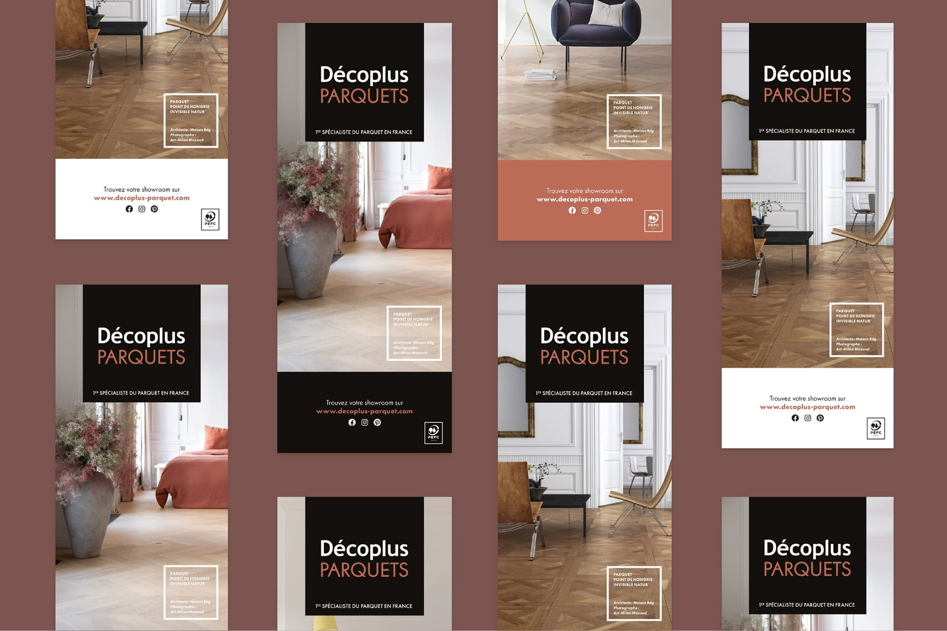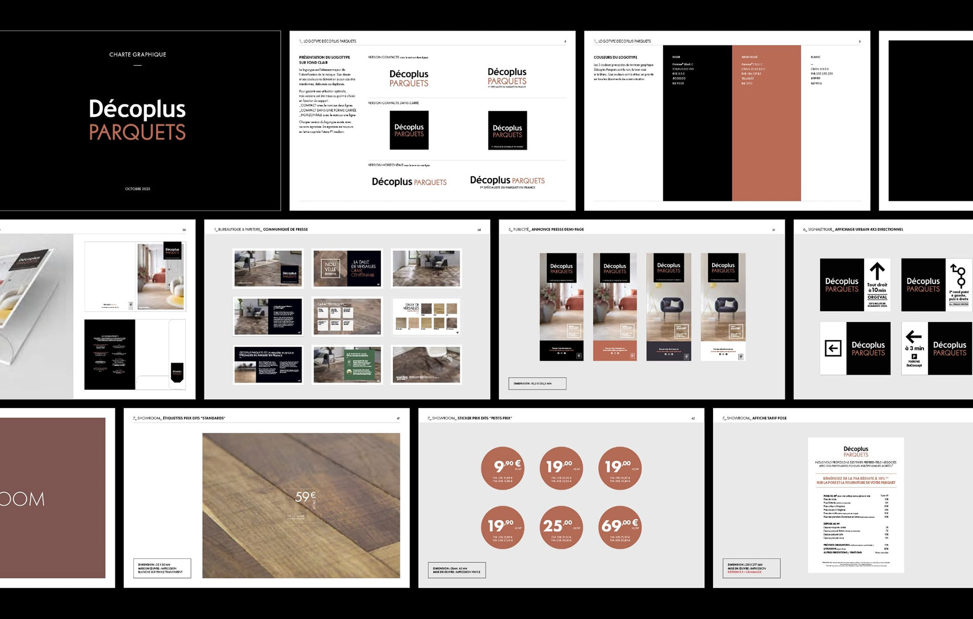 Refonte du logotype et création d’un nouvel univers graphique sobre et élégant pour le premier réseau spécialiste du parquet en France. Conception de la charte et du principe de composition des différentes applications : annonces presse, étiquette prix, catalogue…