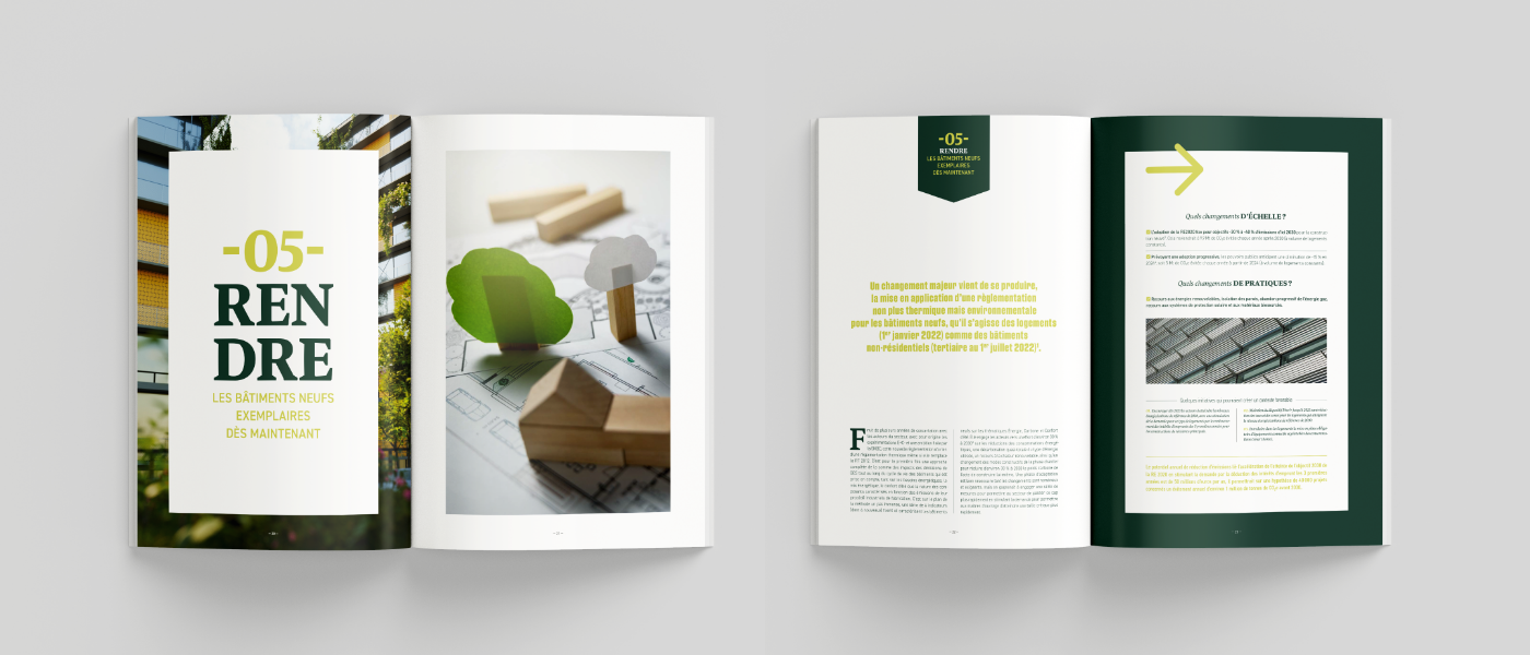 Un livre blanc proposant dix domaines d’actions pour décarboner le secteur du bâtiment, mis en avant par une typographie impactante.